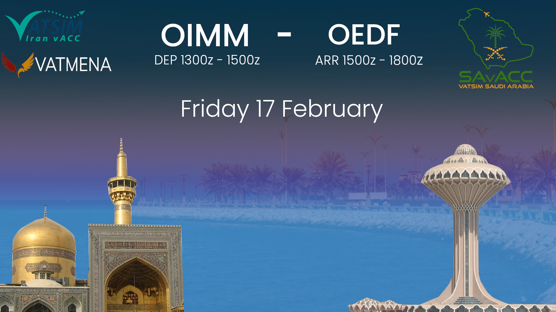 Strap in and join us for a cross-border journey between OIMM and OEDF. Our expert air traffic controllers will guide you through every twist and turn, ensuring that your flight is safe, smooth, and unforgettable. From the vibrant bazaars of Mashhad to the bustling city of Dammam, you'll have a chance to explore some of the most fascinating places in the Middle East. And who knows - you might even make some new friends along the way. So what are you waiting for? Get your flight plan ready, buckle up, and let's soar into the skies together!